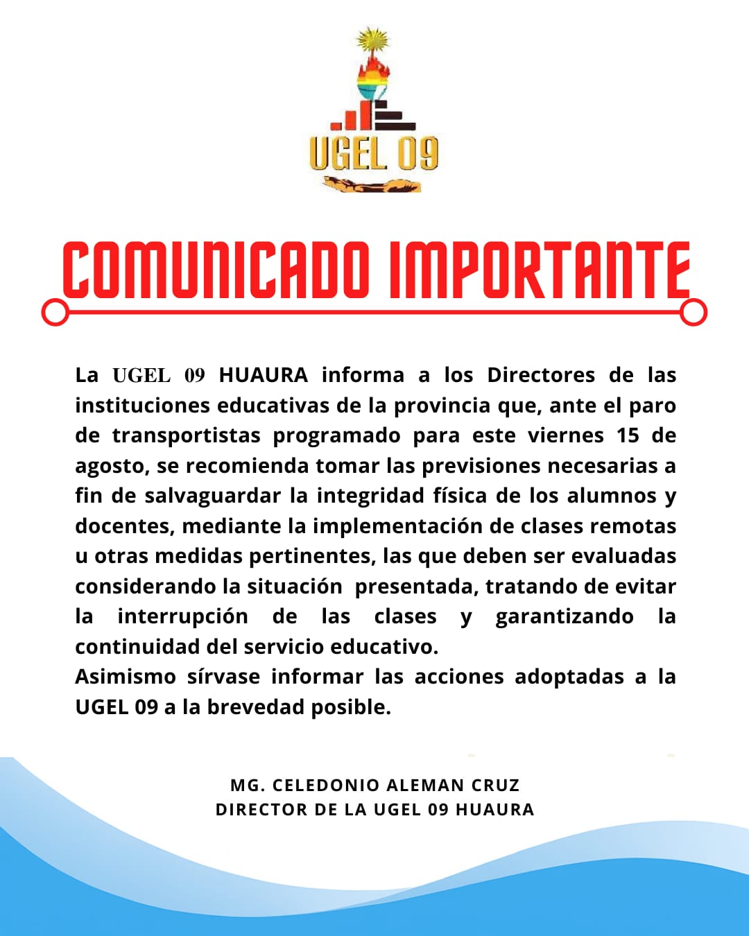 COMUNICADOS SE COMUNICA A TODOS LOS DOCENTES Y COMUNIDAD EN GENERAL QUE EL DÍA VIERNES 10 DE OCTUBRE DEL PRESENTE AÑO SE PROCEDERÁ A ADJUDICAR LAS PLAZAS PUBLICADAS EN ESTRICTO ORDEN DE MERITO, POR PUN Y POR EXPEDIENTE (EN AQUELLAS ÁREAS DONDE SE HA EVALUADO EXPEDIENTES Y EXISTA CUADRO DE MERITO VIGENTE) A LAS 8:30 A.M. EN LA SEDE DE LA UGEL-09-HUAURA.......................... .............................................................................................................. PUBLICACIÓN DE PLAZAS VACANTES PARA EL PROCEDIMIENTO DE CONTRATO DOCENTE - 2025.......................... .............................................................................................................. Cuadro pre publicación de resultados , etapa interregional de auxiliares de educación 2025, causal interés personal.......................... .............................................................................................................. Publicación final de plazas para la reasignación auxiliares de educación 2025 etapa interregional por interés personal y unidad familiar.......................... .............................................................................................................. SE COMUNICA A TODOS LOS DOCENTES Y COMUNIDAD EN GENERAL EL CRONOGRAMA PARA ADJUDICACION POR EVALUACION DE EXPEDIENTES PARA LA PLAZA DE EDUCACION FISICA DE LA I.E. MERCEDES INDACOCHEA LOZANO.......................... .............................................................................................................. CUADRO FINAL DE RESULTADOS NOMBRAMIENTO DECRETO LEGISLATIVO Nº 276 UNIDAD DE GESTIÒN EDUCATIVA LOCAL Nº 09 - HUAURA......................... .............................................................................................................. SE COMUNICA A TODOS LOS DOCENTES Y COMUNIDAD EN GENERAL QUE EL DÍA MARTES 09 DE SETIEMBRE DEL PRESENTE AÑO SE PROCEDERÁ A ADJUDICAR LAS PLAZAS PUBLICADAS EN ESTRICTO ORDEN DE MERITO, POR PUN Y POR EXPEDIENTE (EN AQUELLAS ÁREAS DONDE SE HA EVALUADO EXPEDIENTES Y EXISTA CUADRO DE MERITO VIGENTE) A LAS 8:30 A.M. EN LA SEDE DE LA UGEL-09-HUAURA .......................... .............................................................................................................. CUADRO PRELIMINAR DE RESULTADOS NOMBRAMIENTO DECRETO LEGISLATIVO 276 UGEL N° 09 HUAURA .......................... .............................................................................................................. PUBLICACIÓN DE PLAZAS VACANTES PARA EL PROCEDIMIENTO DE CONTRATO DOCENTE - 2025 .......................... .............................................................................................................. Descargar en excel...! .......................... .............................................................................................................. Implementación del proceso de racionalización - Etapa Análitica .......................... .............................................................................................................. Descargar en excel...! .......................... .............................................................................................................. INVITACIÓN REUNIÓN DE COORDINACIÓN - JUEGOS .......................... .............................................................................................................. INVITACIÓN A CEREMONIA POR EL 38 ANIVERSARIO DE LA UGEL 09.......................... .............................................................................................................. En el marco del proceso de reasignación docente – 2025, para las causales de Unidad Familiar e Interés Personal Etapa Interregional – Fase Única, se precisa lo siguiente: En cumplimiento del cronograma emitido por el MINEDU, a través del Oficio Múltiple N00076-2025-MINEDU/VMGP-DIGEDD, se comunica a los participantes que el proceso de ADJUDICACIÓN se realizará el día; MARTES 26 DE AGOSTO del presente año, de manera PRESENCIAL; en la SEDE UGEL 09-Huaura. Según detalle siguiente: .......................... .............................................................................................................. Descargar en excel...! .......................... .............................................................................................................. SE COMUNICA A TODOS LOS DOCENTES Y COMUNIDAD EN GENERAL QUE EL DÍA VIERNES 22 DE AGOSTO DEL PRESENTE AÑO SE PROCEDERÁ A ADJUDICAR LAS PLAZAS PUBLICADAS EN ESTRICTO ORDEN DE MERITO, POR PUN Y POR EXPEDIENTE (EN AQUELLAS ÁREAS DONDE SE HA EVALUADO EXPEDIENTES Y EXISTA CUADRO DE MERITO VIGENTE) A LAS 8:30 A.M. EN LA SEDE DE LA UGEL-09-HUAURA .......................... .............................................................................................................. REUNIÓN DIRECTORES DE LOS CEBA PÚBLICOS CORRESPONDIENTE AL MES DE AGOSTO .......................... .............................................................................................................. REUNIÓN INFORMATIVA DEL II TALLER DE INDUCCIÓN EN EL MARCO DEL PMCDD-EBA 2025 DIRIGIDOS A DIRECTIVOS DE CEBA PÚBLICOS FOCALIZADOS UGEL 09-H .......................... .............................................................................................................. CONVOCATORIA PARA PARTICIPACIÓN DE DIRECTORES Y DOCENTES DE CEBA Y CETPRO EN EL VII CONGRESO NACIONAL DE EDUCACIÓN DE PERSONAS JOVENES Y ADULTAS 2025 .......................... .............................................................................................................. Se pone en conocimiento a la comunidad Educativa de la Jurisdicción de la UGEL N°09 HUAURA, el cuadro de resultados finales de reasignación de auxiliares de educación, según archivo adjunto. .......................... ...............................................